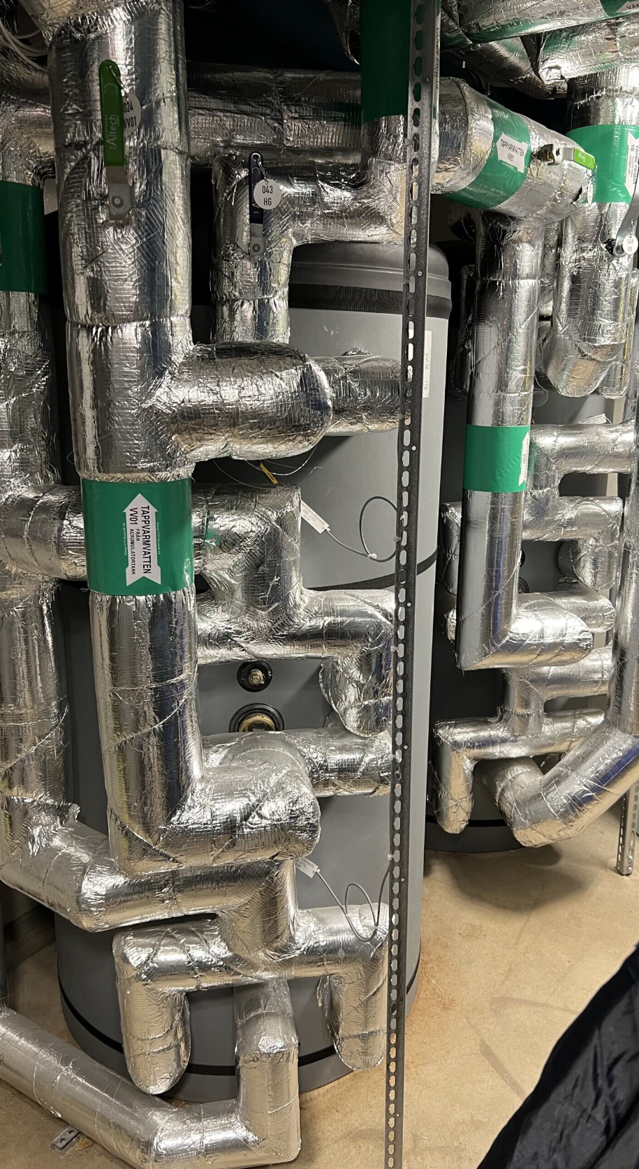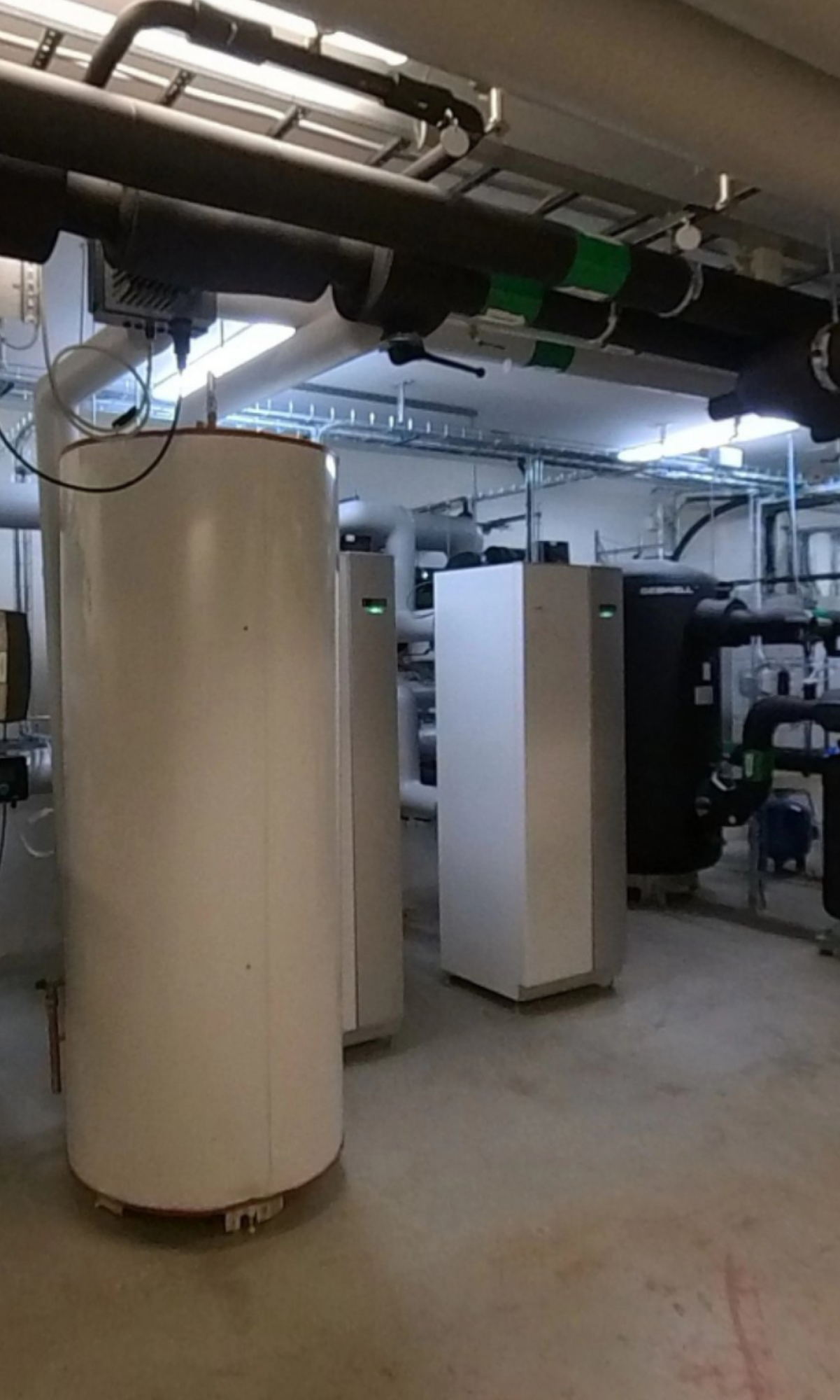 The Energy Centre at the core of the small network consists of a thermal substation designed to cover the demands for DHW, SH, and SC. The energy system interfaces with the Helsingborg DHN network. The Energy Centre also integrates a 4-pipes, geothermal HP. The heat pump is used solely for heating, while space cooling is provided through free cooling, heat being extracted from the building via the Air Handling Units and directed to the boreholes.
